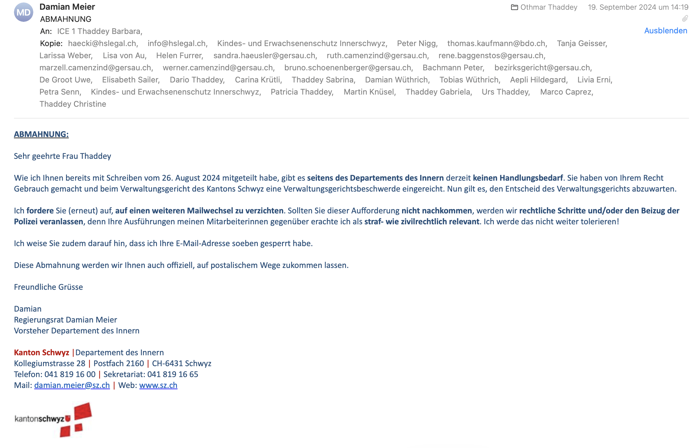 Unsere sieben Regierungsräte des Kantons Schwyz erlauben Behördengewalt, fördern den Behördenfilz und leben die Behördenschikane. FDP-Regierungsrat Damian Meier droht meiner Schwester Barbara Thaddey gar lieber mit der Polizei, als seine professionelle Führungsverantwortung auch bei den Missständen bei der KESB Innerschwyz, Brunnen, wahrzunehmen. Regierungsrat Sandro Patierno (Die Mitte) seinerseits ergreift lieber Partei für eine lügende, betrügende und vertragsbrüchige querulantische Nacherbin, will also lieber der privaten «Bekanntschaft» zu ihrem Unrecht verhelfen, als sich juristisch korrekt, tatkräftig und amtsverpflichtend für Rechte und Verträge unserer 93-jährigen Mutter einzusetzen. Und sogar SVP-Regierungsrat Xaver Schuler missachtet absichtlich und amtsmissbräuchlich-strafbar die Schweizer Rechte und Verträge unserer 93-jährigen Mutter und schützt lieber unethisch das Gremium sowie die bisherigen gesetzeswidrigen Behördeninstanzen. In der letzten Stellungnahme ans Verwaltungsgericht des Kantons Schwyz bezeichnet Xaver Schuler (SVP) sogar unsere berechtigte und begründete sowie beweisbare Eingabe als «abstruse Ausführungen». Solche Worte von einem selbst rechts-, gesetzes- und vertragswidrig handelnden Schwyzer Regierungsrat, der offensichtlich (mit Bezug auf unseren Fall) Verträge nicht korrekt lesen kann, sind höchst dubios und abstrus.